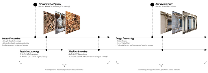Different repositories and GAN frameworks were investigated and finally, Nvidia’s StyleGAN2 was used for the training of this dataset. After a few attempts to set-up the system on a local machine, it turned out to be more comfortable to use hosted servers with the use of Google Colab notebooks.