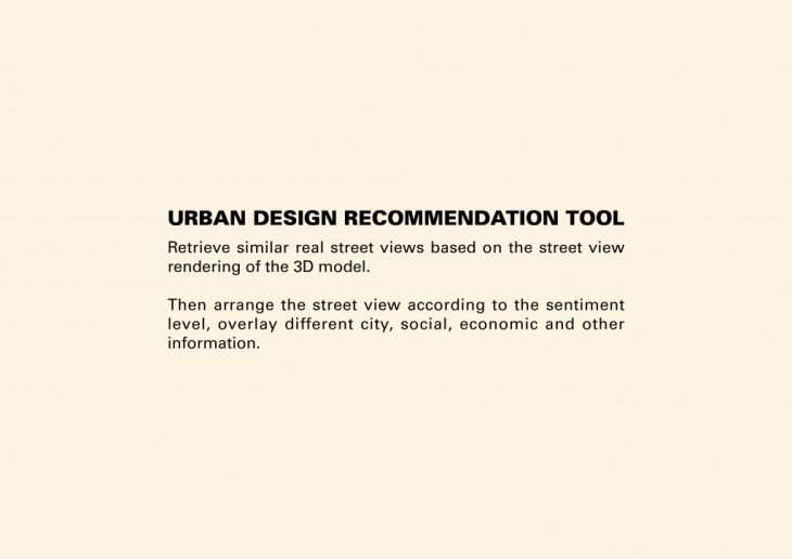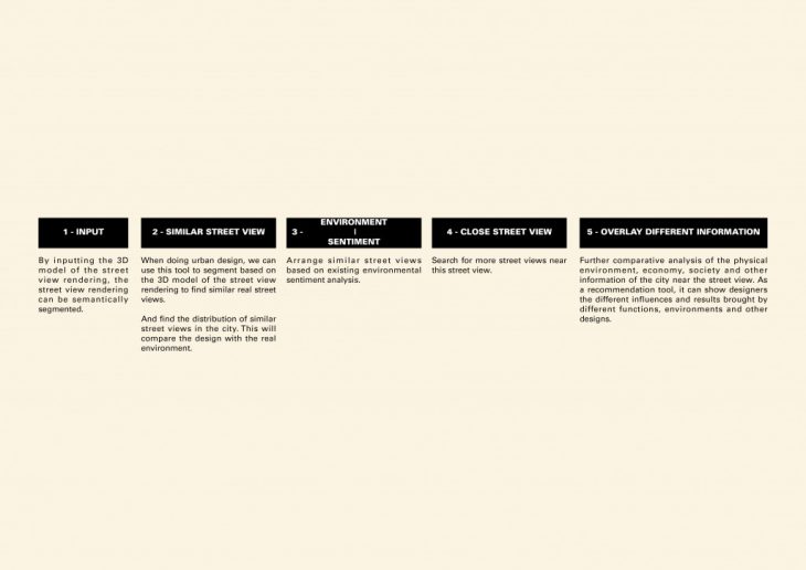 The tool is based on the above content, through the semantic segmentation of the designed 3D model street view rendering image, to find a similar real street view. In order to understand the relationship between design and real environment.