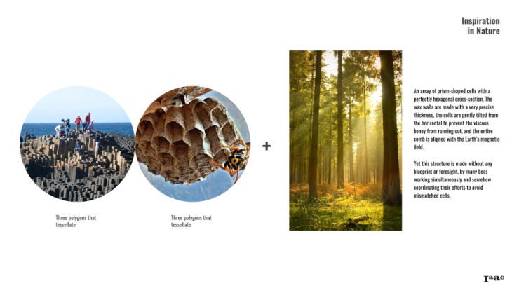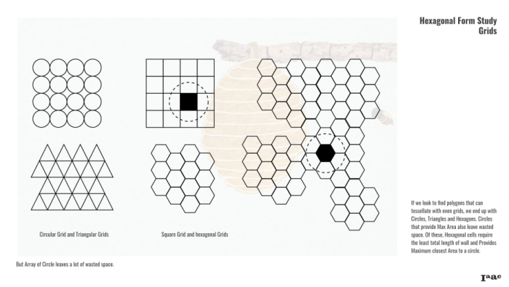 To pack together cells that are identical in shape and size so that they fill all of a flat plane, only three regular shapes will work: equilateral triangles, squares, and hexagons. Of these, hexagonal cells require the least total length of wall, compared with triangles or squares of the same area. So it makes sense that bees would choose hexagons, since making wax costs them energy.To Further investigate into this statement, we drew diagrams of space Organization and Grid. We found that the Hexagonal Grid has Maximum Cell Perimeter and Cell Area for a Given Edge Length.From a structural point of view, the best integration is the triangular one, because of the way each element reacts to the variation of the adjacent elements. By converting the elemental intersection in the hexagonal division from a single triple intersection to a triple double intersection, the structure would gain sufficient structural resistance.This can be done through two methods – translation or rotation. Translation implies moving the elements away from the initial state in order to open up a triangular gap at the existing intersection. This method results in uneven shapes. In the case of rotation, the elements are adjusted around each middle point until a sufficient structural component is created. It is through rotation that the shape is maintained to a relative hexagonal aspect, due to the unique transformation method.