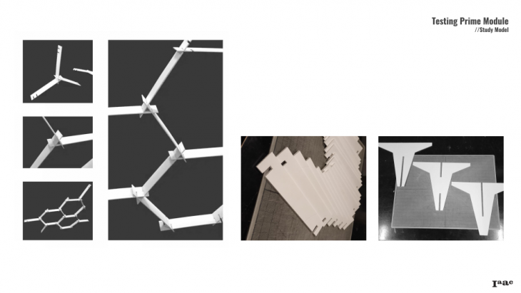 We started to work on the individual element and ways of its aggregations and a variety of intervals that can be produced between them. We have built a physical model in 1:100 scale. We were working on proportions and joints and we were looking for a system that will be stable as a group of units.
