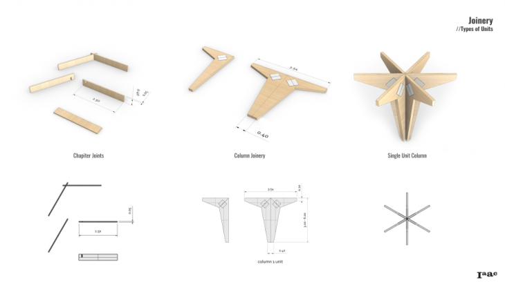 We use CLT – (cross laminated timber)  for columns and chapiters. Chapiter has slot joints. The height of column elements varies from 3 to 6 meters and they are joined with a flat plate fastener. One column is a combination of 6 elements. A CLT beam connects the columns through metal cross-shaped joints.