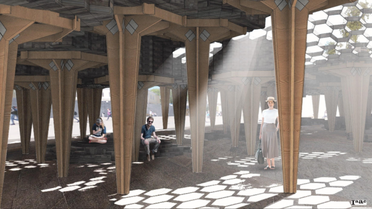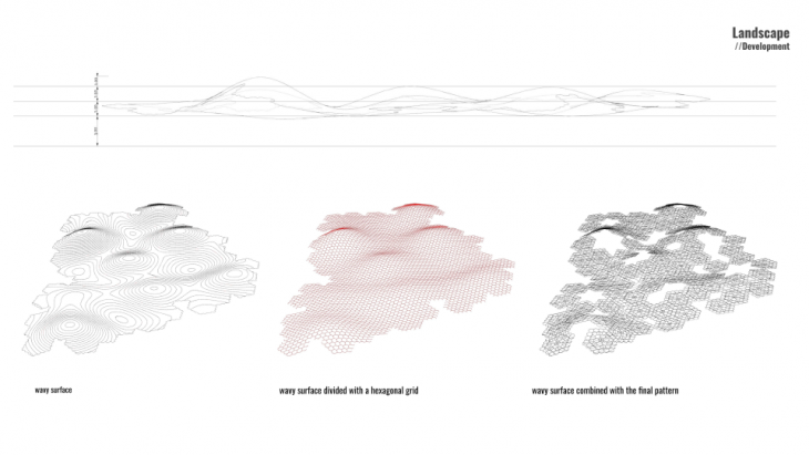 Inspired by two phenomena in nature – hexagons array of cells and refraction of light in an alley of trees, the intent was to create a parametric architectural system responding to environmental, structural and programmatic factors. The idea is to create a system of cells – aggregate various smaller components of hexagon units to create multiple assemblies and different densities that forms a landscape in an urban context. It is modular and easy to assemble and disassemble and can be repeated to any site. The structure is community gathering space for strengthening the local identity and spirit.