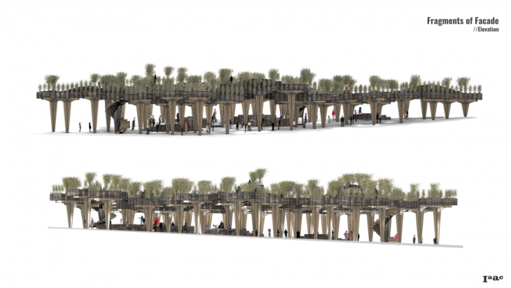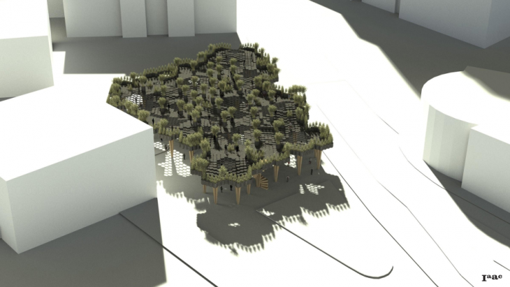 The sheltered space between the pillars becomes a cozy urban terrace with seating areas between the circulation routes.It can be used as a flea market, christmas fair, community gathering space or garage sale. The structure itself can be community built and its construction  may become a powerful event for strengthening the local identity and spirit.