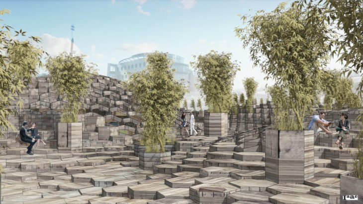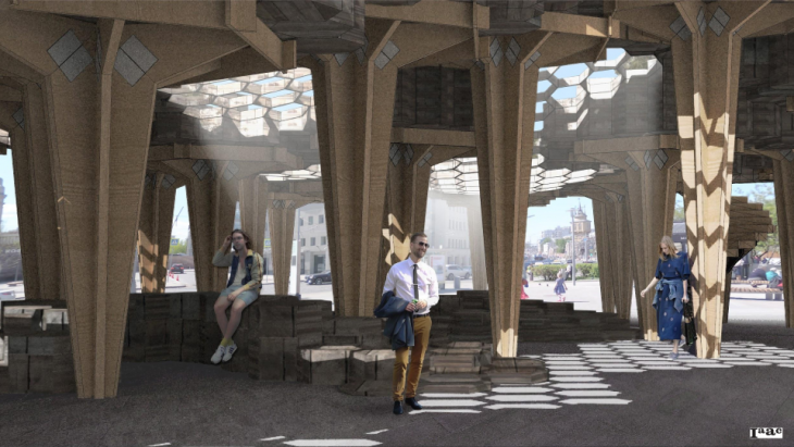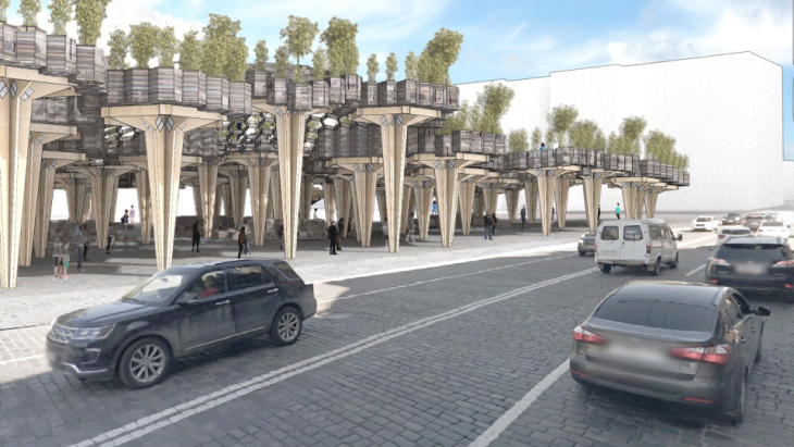 Our structure  appears on the intersection of many citizen roots scenarios and activities as an interstitial fragment between local community and citizens how are coming to center for attractors. It creates 2 types of spaces – dynamic one on the ground level and tranquility one and on the top.We articulate two different conditions of our structure by using two materials: the bearing structure – pillars and beams – are assembled of the prefab CLT panels. For the roof, we choose recycled wood – from pallets, which are always in abundance in any city. For the roof terrace we choose the re-used wooden planks from the cargo pallets, which are always in abundance in any city.The new structure fills in the urban void recreating the street front demolished in the 1970-s by the metro construction. The artificial landscape on the roof is a recreational zone which relief by the alternation of hills and valleys visually decreases the feeling of the open space and creates multiple lagoons for rest. The hills become viewpoints open at the historical center’s landmarks.