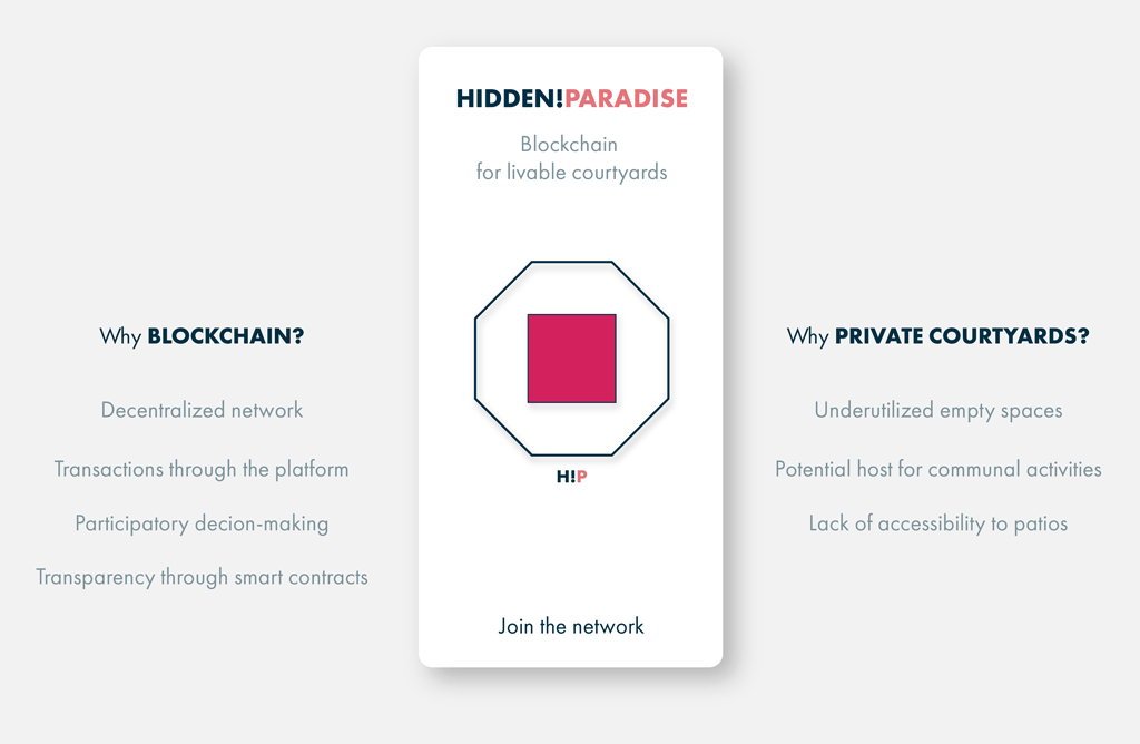 The main proposition behind using blockchain is for making local, transparent, participatory decisions and equal say for the usage of the underutilized patios. It would also help to deal with short-term smart contracts for space usage and to make transactions through the platform. Incentivizing participation through utility tokens it would also help to enhance the community and build new relations.
