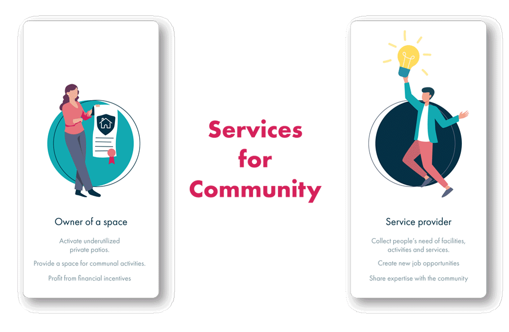 In order to empower communities in these blocks, we intend to match these underutilized patios in the courtyard with the required services for the people residing in the block. The idea here is that the people can list down the services or activities that can be hosted in these patios, and the owners of these patios can then rent them in exchange for benefits. Doing this through the use of blockchain will create a common platform and help to keep the process decentralized and transparent. People will be able to interact and share their ideas for space with each other on the platform.