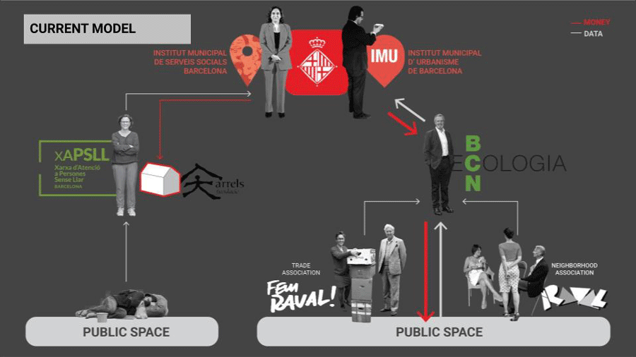 The current system that works with the public space in seperated in two different disconnected directions. One, is related to the social services and the institutions; the other one, is in relation to the urban planning stakeholders.
