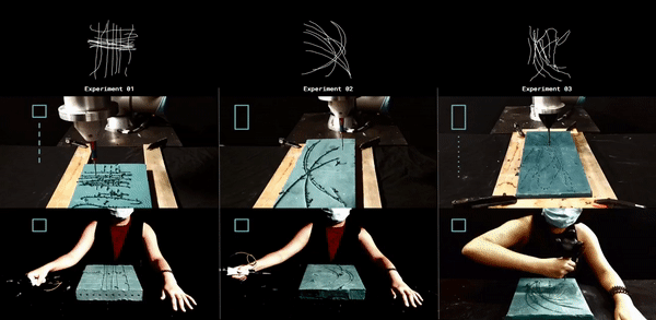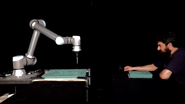 As a first step, the first experiment shows the ability to capture and recreate a human motion during the fabrication process. The recording was then remapped to the robot’s workspace and engraved. Doing so shows the potential in creating a vast database of human gestures for later usages.