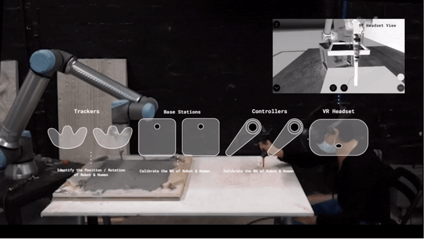 About connecting to robots, our research got a great boost from the workshop “Drafting Deception: Developing Mixed Reality Architectural Environment” designed by Jeffrey Anderson, Ryan Luke Johns, where a setup connected the UR robot to the VR environment in UNITY and ROS. By taking the basic setup from this workshop and altering it to our needs, we rapidly closed some of our technical gaps and proceeded to material experiments. Due to the research limitation and the feedback from the workshop, at this point, we decided to shift our research methodology. At this stage, we recorded the position, rotation, and force from a handheld tool and sent it through IK as robotic instructions.