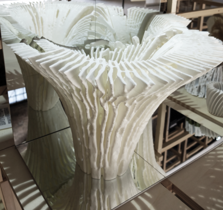 Morphogenic explorations were informed by the mycelium behaviour in a series of scaffold designs. The most successful design language provided a range of PLA densities through branching lamellae and opportunities to both blur and expose the mycelium growth.