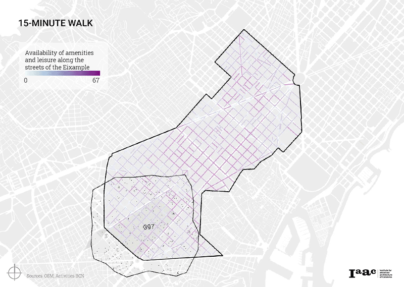 For determining why people are moving within Eixample, we firstly analyzed the quantity of amenities that exist on a 15-minute walk radius for each neighborhood, also assessing the availability of these services in each street. Then, by evaluating the land uses, we have captured the characteristics of the entire district and in particular the lack of green areas in a part of the city which is so populated. These analyses have been possible using the dataset of Barcelona Activities provided by InAtlas, combined with data from OSM.