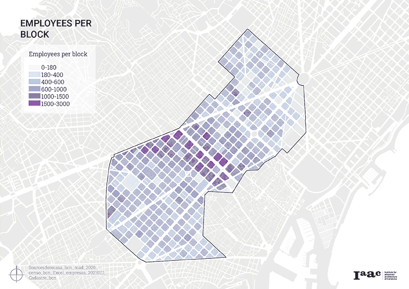 So firstly, we were able to assess the number of people who work in Eixample, from the CensoEmpresas dataset, and identify that their concentration is mainly around Passeig de Gracia Street. Then, we analyzed the origin of these workers with Mobility INE dataset, evaluating where employees of Eixample are coming from. We identified the percentage of people from other neighborhoods coming to work, and together with data from RFD, we were able to assess their income. Based on this and additional information, we were able to compare and visually represent that the income of the workers is usually lower than the income of the dwellers.