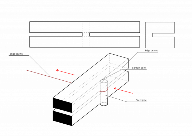 A disadvantage of this proposal is that all the forces are transferred between the pipe and the beams at a single point. To mitigate this and help spread the forces, we removed part of the beam creating a “pocket” that increases the contact surface area. An external piece could also be used, to avoid weakening the beam.