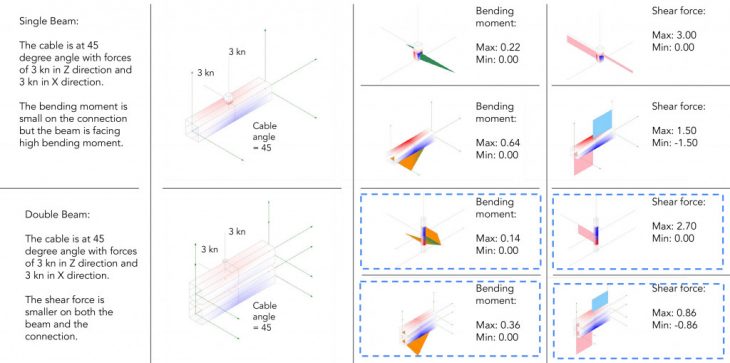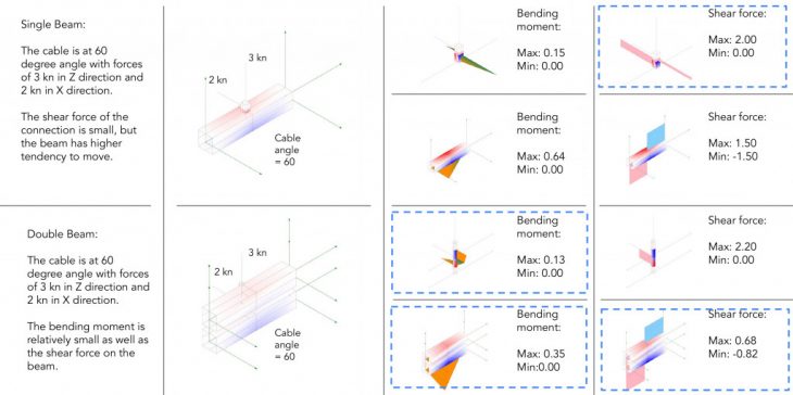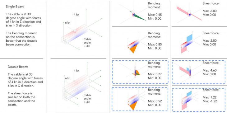 Using Karamba we performed a structural analysis of the cable-beam system of the proposed structure. Based on these structural studies, we proposed and developed two connection designs. At a later stage, the prototypes will undergo testing and their strength will be compared to the Karamba analysis prediction.
