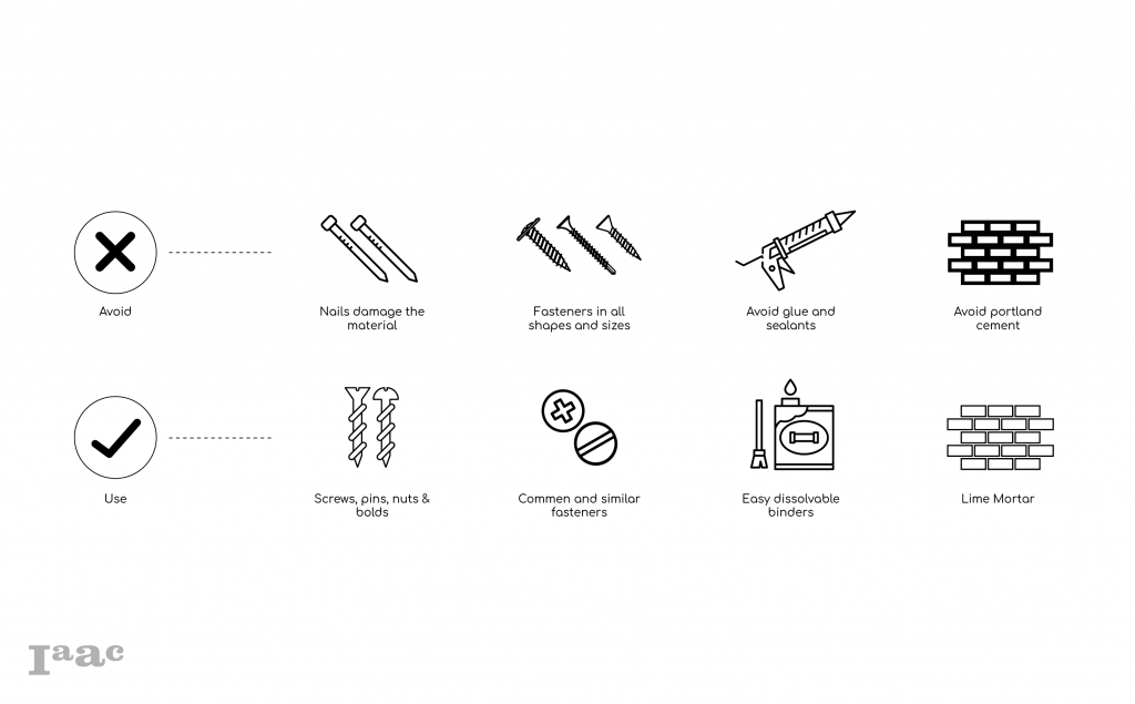 The general practice for assembly with a view to disassembly is to use mechanical connections. This ensures that a building can be assembled and disassembled without damaging the material.