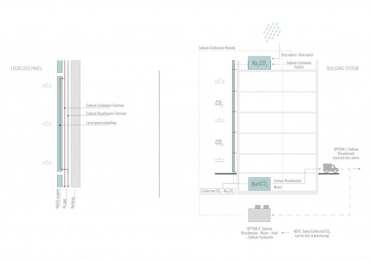 The modular aspect of Ingeo allows it to be adaptive and installed on blank facades of existing buildings, most preferably those that exist in highly-contaminated areas (e.g., parking, city towers, trade centers). This process requires not only the installation of panels but also the creation of an additional washing and CO2-separation system inside the basement of the building. This washing system is referenced in context 8.0 Unloading CO2 Cycle.