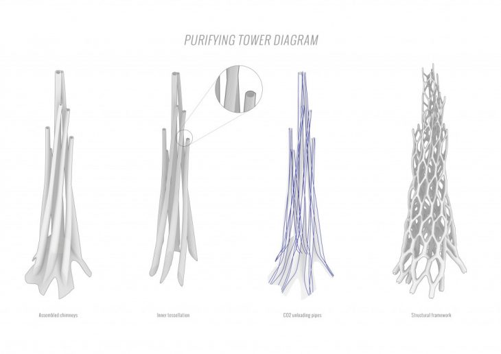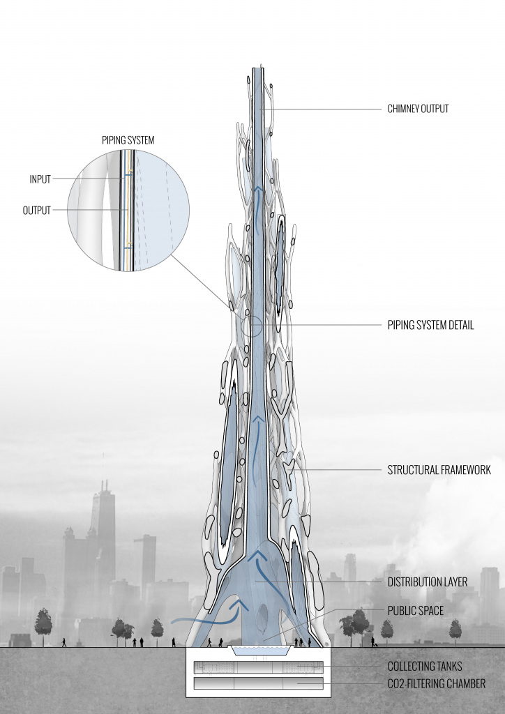 By designing an optimized structure with the integration of Ingeo’s key parameters, we are able to maximize the performance of the shape and structure itself, but also attract public attention to the CO2 issue. The structure consists of 7 high and curved “chimneys”, merged together and covered by Ingeo modules from the inner side. Each chimney is wide at the bottom and becomes more narrow when reaching the top. Such configuration results not only in the maximal surface area but also provides stronger airflow on the inside of the tower, increasing the efficiency of CO2 absorption.
