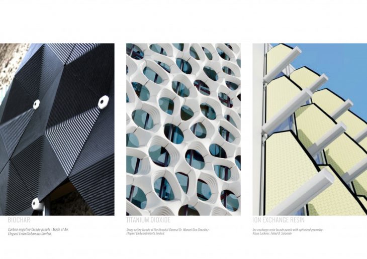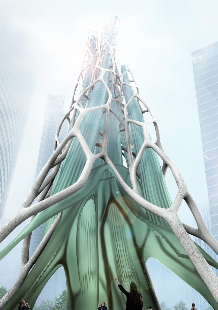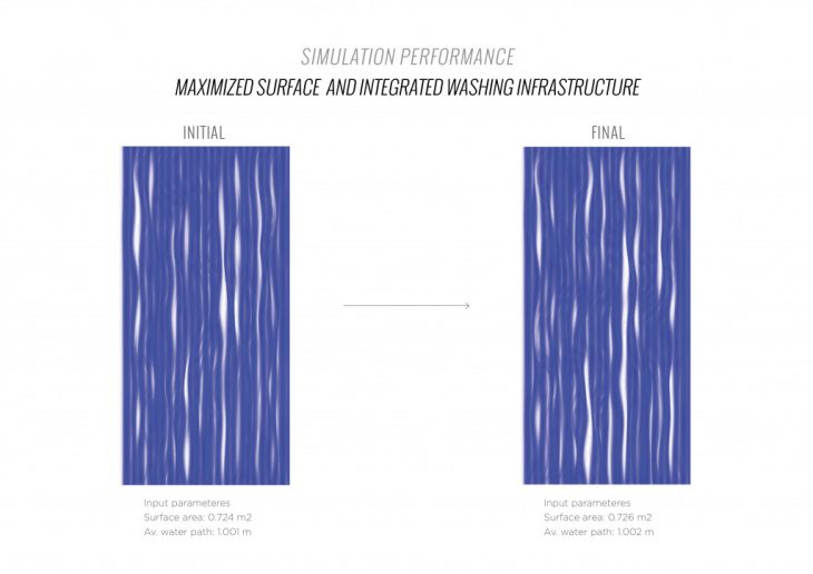 The inner surface is tessellated for further area maximization and better washability of Ingeo modules. The entire volume of Air-Purifying tower is optimized to minimize the shade created by the building and its’ influence on the city silhouette. In order to attract people’s attention to the air contamination and to visualize the data of CO2 levels, the Ingeo modules of the tower are coated in a special solution, which changes color depending on the CO2 levels in the air.