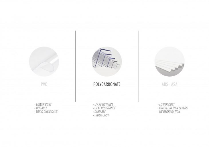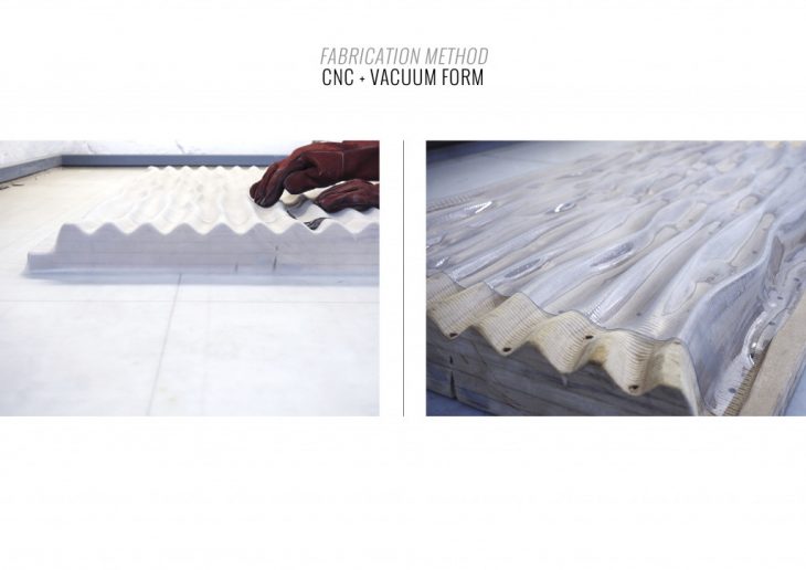 We propose to manufacture Ingeo modules through the process of vacuum forming Polycarbonate sheets, on which we apply our performative material coating. 3D-Printing complex geometry is also an option to apply the material coating, however, this method would have a much higher manufacturing cost. By designing the geometrically optimized surface of our module sheets, we are able to develop the form and digitally fabricate the molds through CNC milling. Three molds are made with allocated geometry for the front, middle, and back sheets. After manufacturing, the three vacuum-formed polycarbonate sheets will join together to create 1 Ingeo module.