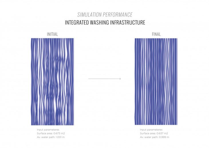 Once the resin is saturated with CO2, a sprinklers system initiates the incremental washes to unload the CO2 from the panel. We tested the unloading system inside the washing apparatus. A tank full of sodium carbonate solution installed at the top of the panelized facade, releases the solution through the panels, using gravity to wash the vertical waved surfaces of the interior panel walls. The seamless connection from panel to panel, allows the washing solution to continue towards a collection pipe in the bottom panels, which then leads to a basement tank. In order to prevent the “water hammer” effect, the facade is vertically divided into several sections, up to 10 meters high each.