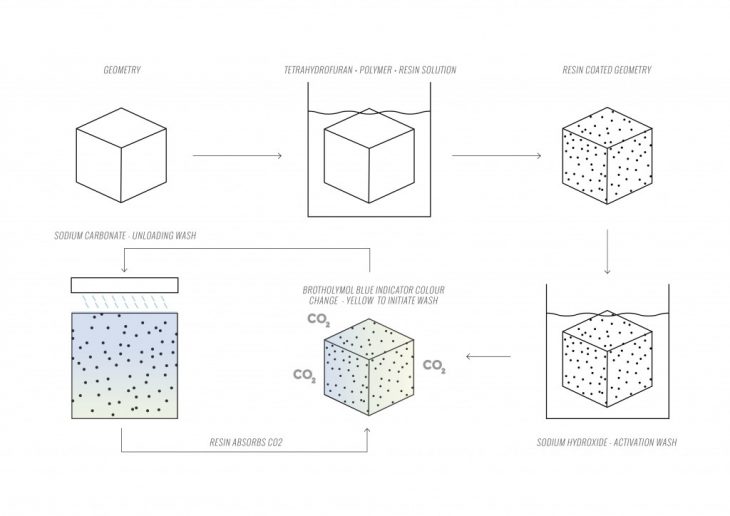 The cyclic protocol of the IER material system consists of a series of steps. First of all, the base geometry is dipped in a polymer coating, which contains 10% of the IER, 10% of PC and 80% of tetrahydrofuran. According to our experiments, the geometry, when made of the same solution polymer and then coated in the solution, leads to melting of coating and the surface polymer layer. When the coating gets dry, the resin requires a Sodium Hydroxide (NaOH) solution wash, to activate the CO2 absorbing capabilities. After soaking in the NaOH solution for 1 hour, the geometry becomes capable of absorbing Carbon dioxide. The shown color indication of CO2 absorption is highlighted in 7.8 Method of Materializing Data.