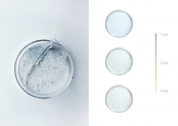 As a result, this system of physical color change can perform as an indicator to initialize the washing of a saturated facade. Beginning with a bluish hue, the panel color will change to a green/yellowish hue as it absorbs CO2. Not only is this an indicator to unload a saturated facade, but also a method of materializing data, physically indicating the current surrounding air quality and rate of pollution saturation.