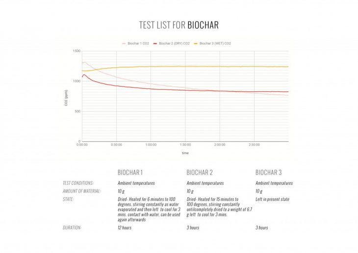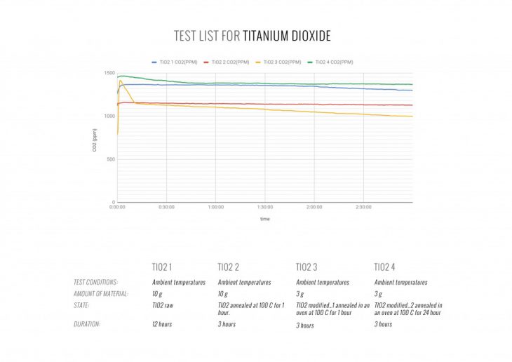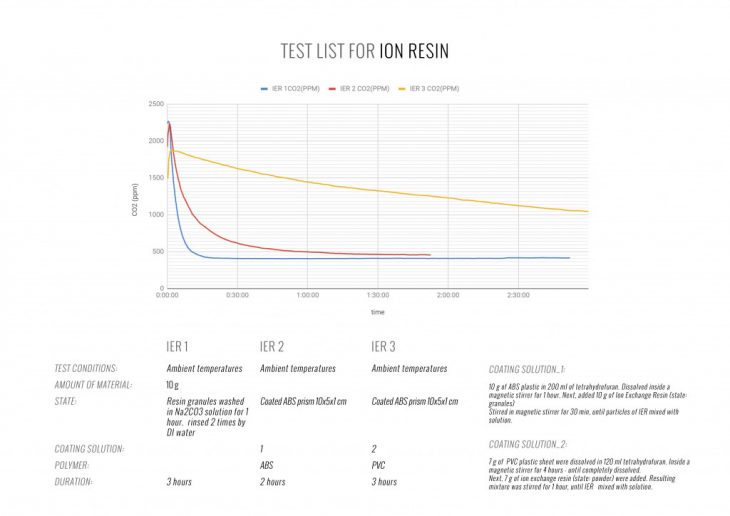 Initially, we considered three main materials, that obtain CO2-absorbing capabilities. We tested biochar, modified titanium dioxide (TiO2) and ion-exchange resin to find the best candidate for active material in performative ingeo modules.