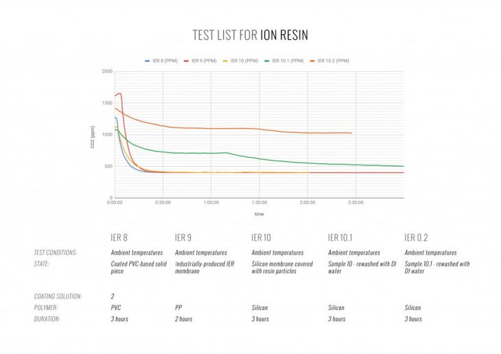 IER is a polystyrene sulfonate and comes in the form of translucent yellow microbeads. The main application of IER is water filtration or purification due to its ability to exchange ions. However, professor Klaus Lacker was the first person to utilize these abilities for air filtration by modifying the IER. The modification process includes dipping the material in a Sodium Hydroxide solution, which gives IER particles the ability to absorb CO2 from the surrounding air. By changing the physical state of the IER beads via process of melding and binding the loose particles with polypropylene, Professor Lacker developed a flexible and feasible sheet product which successfully absorbs CO2 from the ambient air with relatively low CO2 concentration.