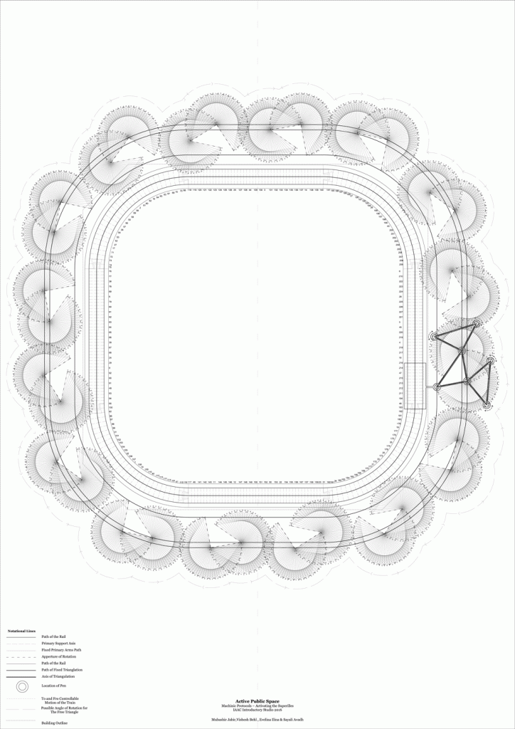The train along a circular path to move the primary fixed triangulation, is an attempt to add another dimension to control the canvas, we added a secondary triangulation as a free axial pivot to the primary. This was further amplified by a third free triangulation. The design of the triangulation was a design alteration to account for the equilibrium of stability.