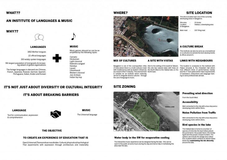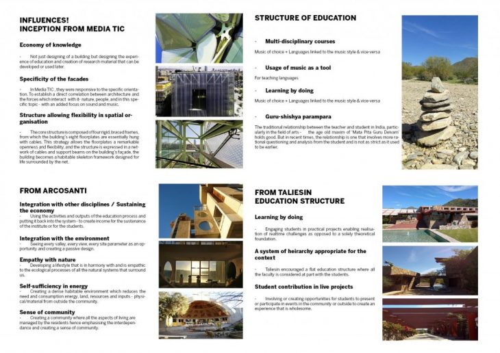 With the self sufficient trip across California & Arizona and the case study of MEDIA-TIC as the starting point, the project of  creating an educational experience beings. The institute of music & languages is one that deals with the manipulation of sound, and at it’s heart, aims at making sound tangible, in architecture, and aims to find way to exploit sound energy or other technologies to make the building self-sufficient. The focus, in terms of the education system, is the integration of music and languages as tools for learning, communication & creation of new art forms,and user experience which explores the relation between the two.