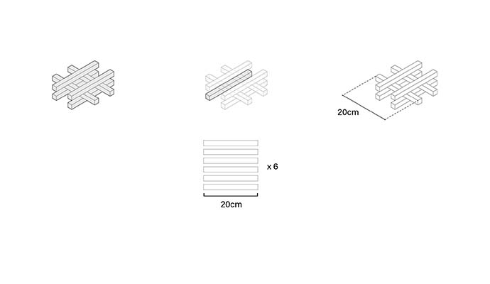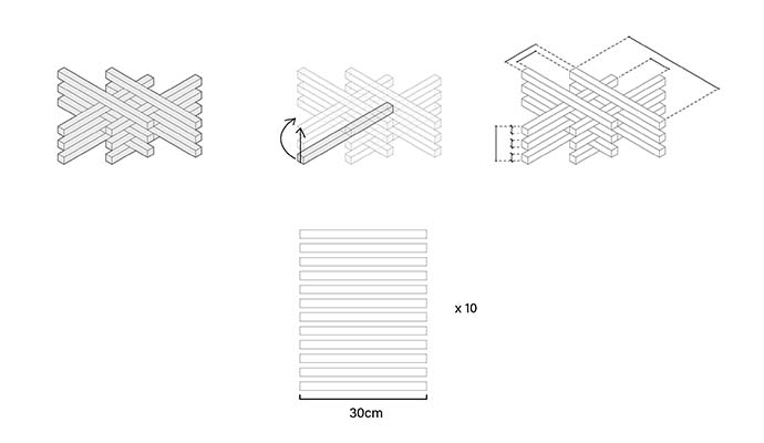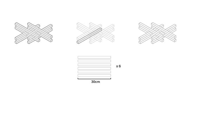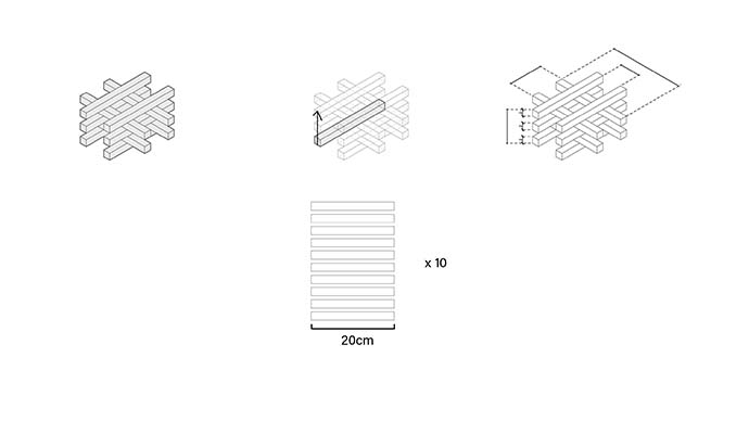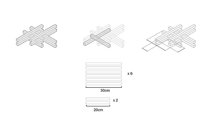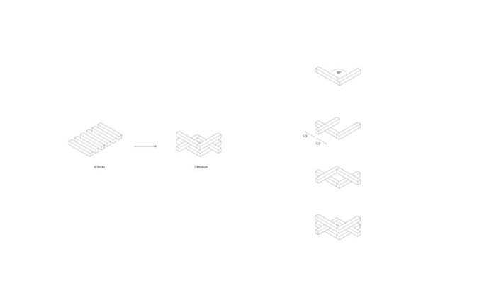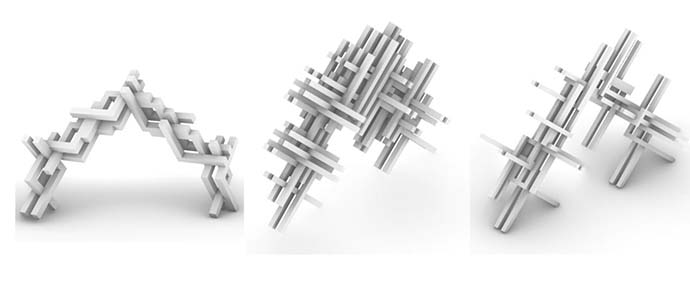 The modules are connected by interlocking them with each other. this provides stability and rigidity when the arch start to overhang to create the curvature. The top piece slides-in to connect the two arches acting as the key stone of the arch.