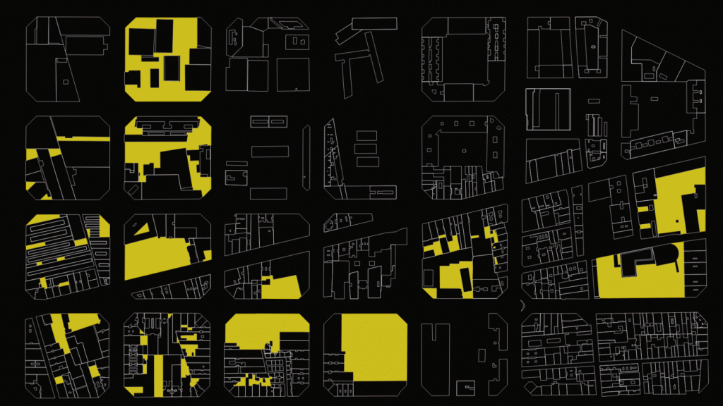 Unbuilt spaces that are a lot in 28 blocks were separated into 4 categories: private parks, public parks, unused spaces and parking lots. This project is focused more on unused spaces and parkings as parks are already designed and sometimes not accessible to intervene. The summarized area of interest is 120 000 m2. All these spaces were separated into those that are less than 1000m2 and more than 1000m2.