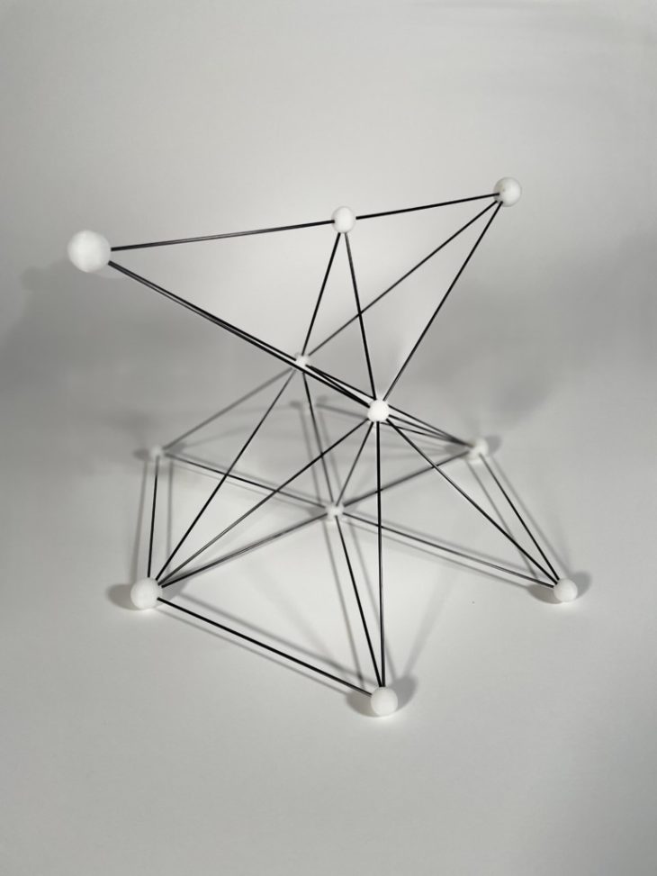 When fabricating recursive forms with the 3D printer, the team created a recursive geometry based on the idea of a molecular network, where the spheres were design as connectors to attach wire rods together in order to achieve a final assembled geometry. The spheres were modeled as junction points with minimal tolerance holes that hold the 2mm wire in position. The biggest challenge with this project was aligning the nodes on the 3D printed raft and supports in such a way that the holes were not compromised.