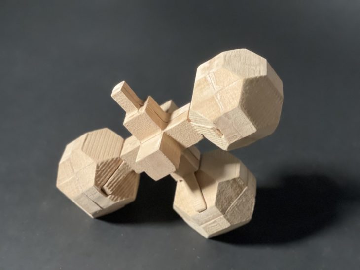 When fabricating recursive forms with the laser cutter, the team used a sphere as the base geometry and explored radial slicing technique with Slicer for Fusion 360 software. To achieve the recursion, the aggregation strategy of looping one section of an axis from the first sphere through another section of an axis from the second sphere was explored. The biggest challenges with this form were finding the optimal tolerance between the joints and discovering the most effective method of aggregation.