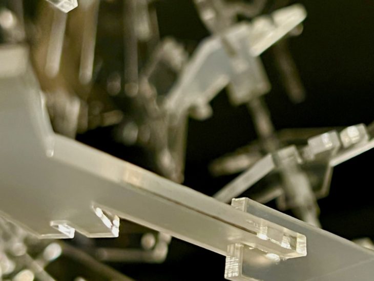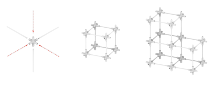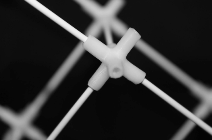 The team designed a pixelated recursive geometry based on the idea of using a single node geometry to test the 3D printing technology. The nodes are constructed with six directions in mind, enabling for the building of wire boxes with minimal tolerance holes that keep the 2mm wire in place.