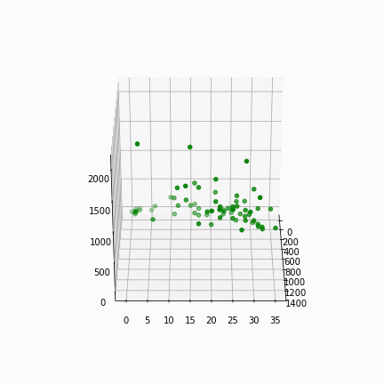We start clustering different sets of parameters into 2, 3, 4 and 5 clusters. The use of 3-dimensional graphs is sometimes hard to analyse, but has helped in deciding what sets of parameters can be used in this exercise. The parameters are: number of inhabitants, built surface (m2), surface above ground (m2), surface of underground (m2), with the subject column being the block code (highlighted in red).