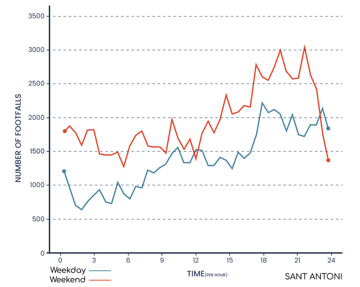 A large set of footfall dataset is filtered and split into chunks. The distribution is then analyzed and visualized for both weekdays and weekends in order to see the movement of people in the district of Eixample.