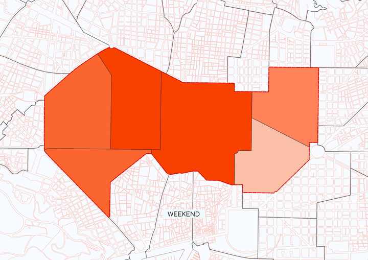 Number of footfalls is analyzed per neighborhood, per 3 hours for both weekdays and weekends. To do so, the clipped footfall was grouped per 3 hours and visualized through the graphs.