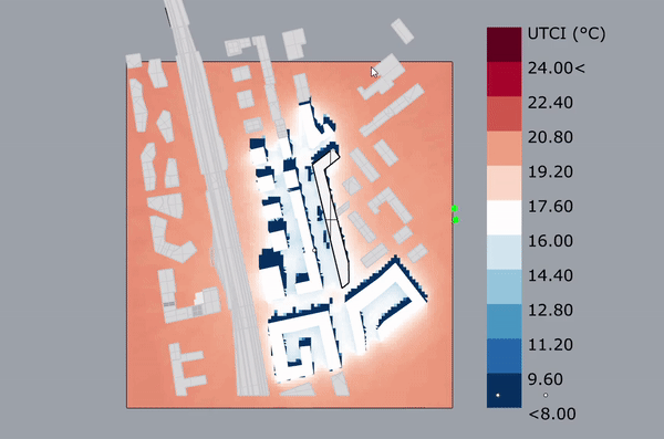 What we can see from the gif. above is, that the thermal comfort decreases from 12 – almost 24. This means that there is no thermal stress included, but actually not taking into consideration the local conditions such as thermal massing of the street and the surrounding surfaces.