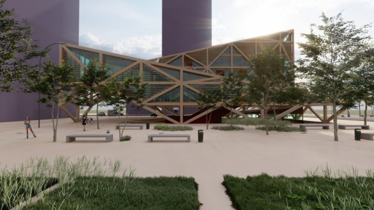 The massing strategy was formulated by taking into consideration the eastern and western winds, optimizing their movement was fundamental for the overall form of the building. As the building is enclosed by two high rise buildings the northern facade was moved down and the southern increased to maximize sun exposure, particularly during the cooler months. A connection between the two buildings was then attained and public space was gained underneath. The connection to the surrounds, specifically the ´huerto urbano´ located in front, was accomplished and a public ramp which connected to the roof structure. The exterior truss structure, allowed for the optimization of the interior space.