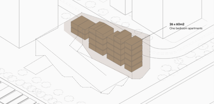 The program of the building is composed of a kindergarten, public roof, a communal kitchen, laundry space, in addition to 26 apartments housing 65 people.