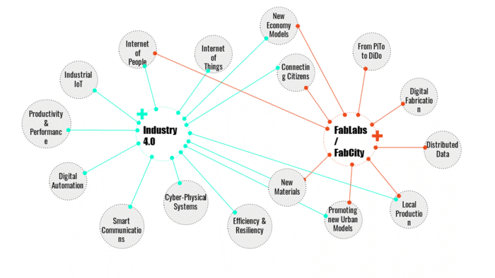 Thus, we identified our main objectives that are the concepts of Industry 4.0, Fablab/Fabcity and their intersection with Circular Economy. What we want to achieve is to mix the beneficial aspects of FabLabs and Industry 4.0 and create our project based on a circular model. Local Production, New Materials, new Economy models and new Urban models and the connection of citizens are some of the aspects, technologies and benefits that we want to implement in our project.