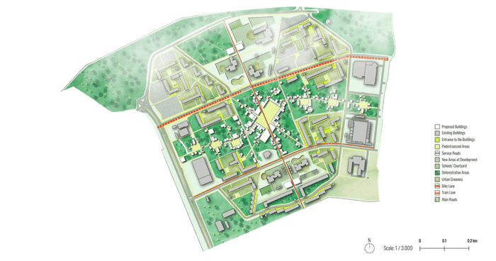 Finally, after we studied the current program we wanted to integrate it into the LABsnamae system but also provide new uses, that were not there that we understand are necessary for our area. In addition, in our area the development is mostly tall. Most of the buildings have heights between 20 to 30m tall and the lack of smaller elements combined with many open spaces leads to an unbalanced vertical development with no sense of human scale in the area. To solve this we regulated the heights of our new buildings to not exceed 12m of height.