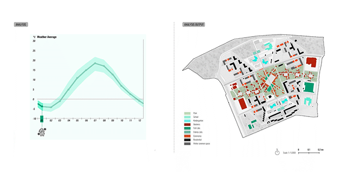 We used the wind analysis to understand where we need to protect the public space from the wind. During the year, wind comes mostly from the south and the average speed varies throughout the year. The windier part of the year lasts for 5.7 months, from September 19 to March 10, with average wind speeds of more than 13.8 miles per hour. The calmer time of year lasts for 6.3 months from March 10 to September 19. Through this analysis we were able to locate some strategic points to add different elements as a barrier from the wind. These elements can be different buildings, different trees, forest areas etc.