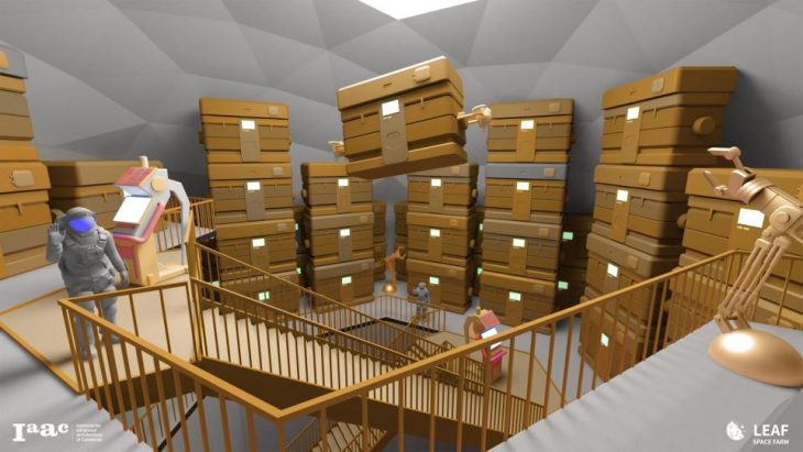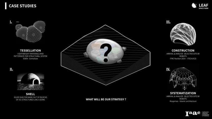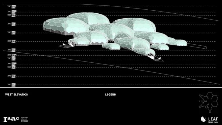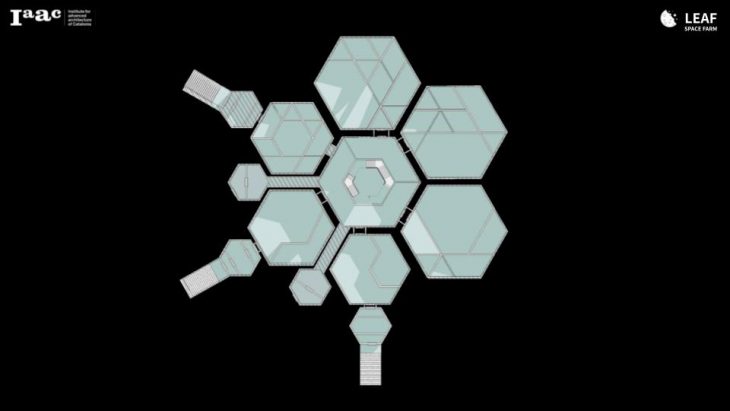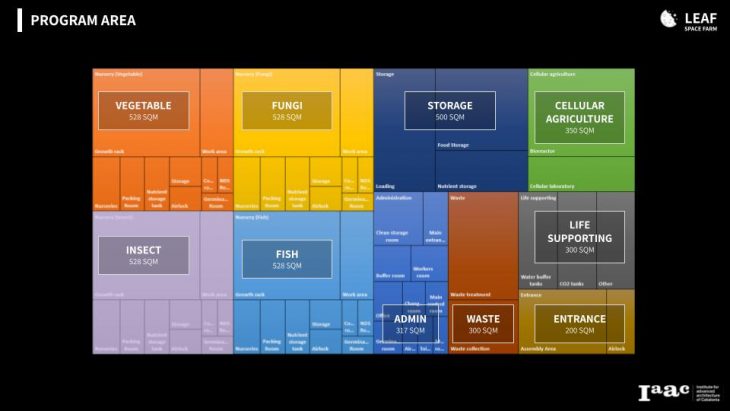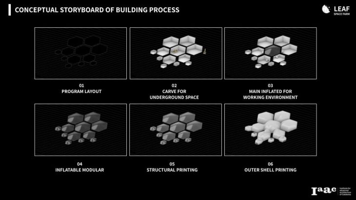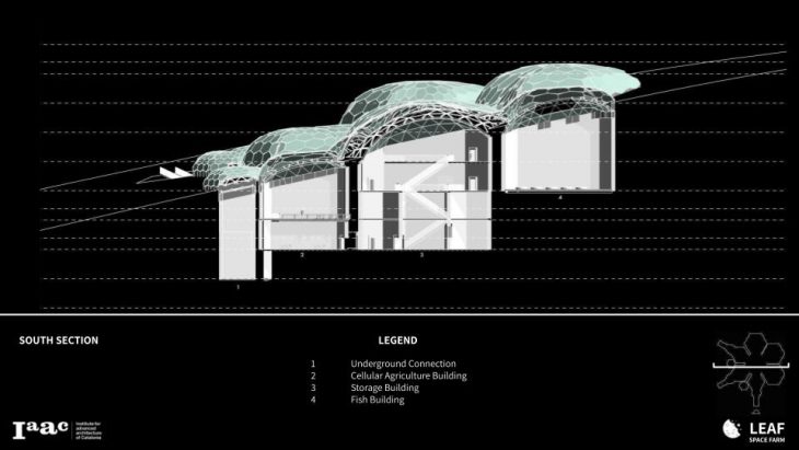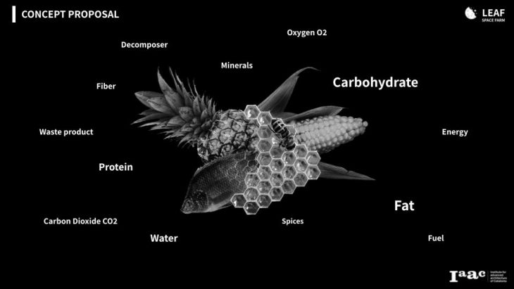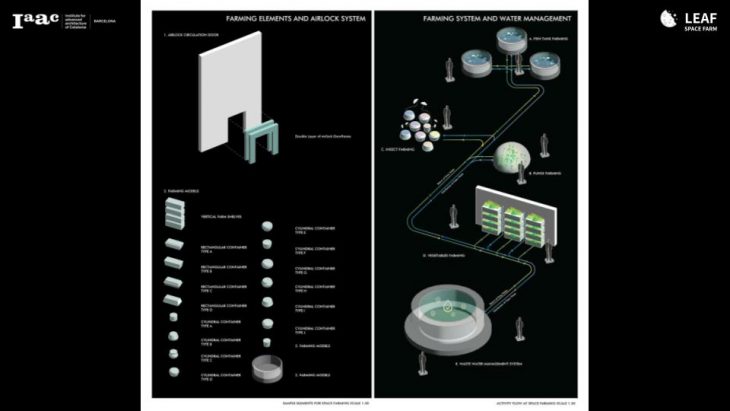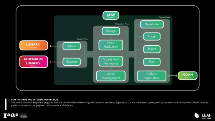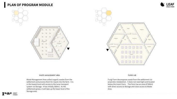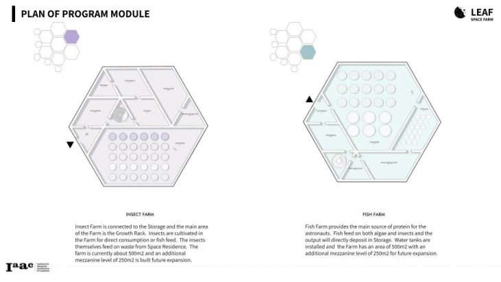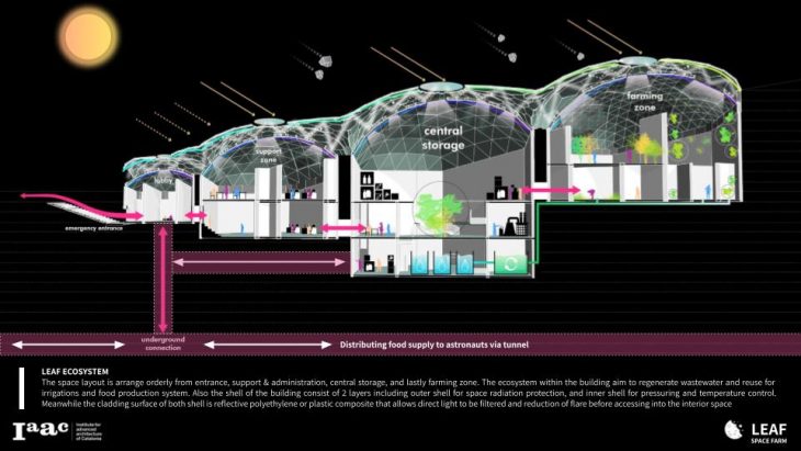 LEAF Space Farm is based on smart farming technology tested on Earth. Smart farming tackles the issue of farming in urban context with the aim to mimic ecosystem for transforming waste into food. We are facing a similar problem on the Moon. The technology is based the symbiosis relationships between four elements – Fish, Fungi, Insect and Vegetable. For example, water cycle is recreated here when grey water from space residence enters the space farm and it is filtrated by the vegetable sector and the resulting water can be fed to the fish or insect sector. Similar cycles are possible for carbon dioxide, ammonia and phosphates from human waste to turn into carbohydrates, fat and protein for the food consumption of the astronauts. LEAF relies on solar energy to power its cycles. In order to feed 100 astronauts, 5000 square meters will be required considering energy requirement of the astronauts and the inefficiency of lunar farming.