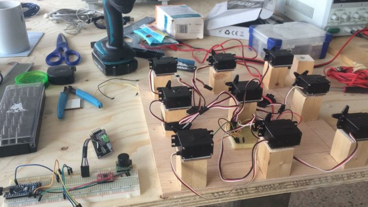 3×6 meters of light fabric is held from the the structure with nylon strings. Each string is connected to a Servo. There are 16 servos in total with a distance of 75cm from each other.