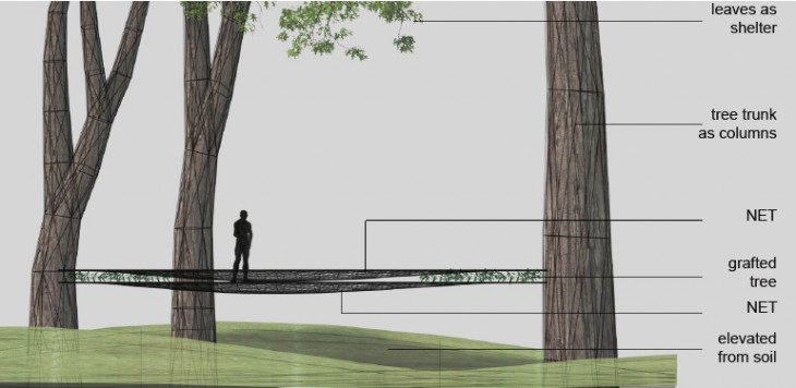 The trees are columns that will support the lightweight structure; the leaves are natural shelters that protect from direct sun light; the structures are elevated from the soil respecting and allowing nature to heal itself, then avoiding unnecessary footprint.