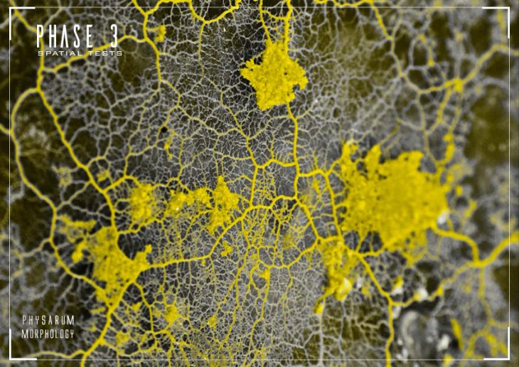 This research is divided in two parts: the first part focuses on the analysis of the natural properties of said organism, and the second part concentrates on the main question being how to apply these properties into an architectural artifact using computer-aided prototyping and the fabrication of the actual structure. The presented research, material tests,- and techniques demonstrate the first successful physical model result of the complex bio-machine capable of altering the interior space perception through the densification of the Physarum Polycephalum’s dynamic patterns.
