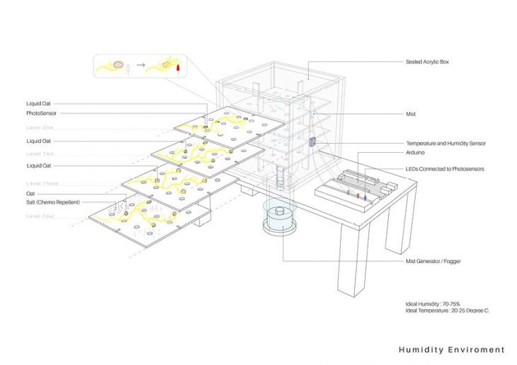 The Slime Mould’s growth is controlled by the nutrients’ source which comes directly from a food-distributor machine. Said machine deploys the food in specific platforms inside the panel allowing the patterns in each layer to be reciprocal thus having different densities. The panel also includes a humidifier dispenser that controls the levels of humidity inside it. The Slime Mould requires an air-tight environment capable of maintaining the humidity and protecting the organism against outside agents that could alter its development. The result is a dynamic wall that not only changes in time, altering the interior space through color and opacity but also affects the mood and experience of the spectator.