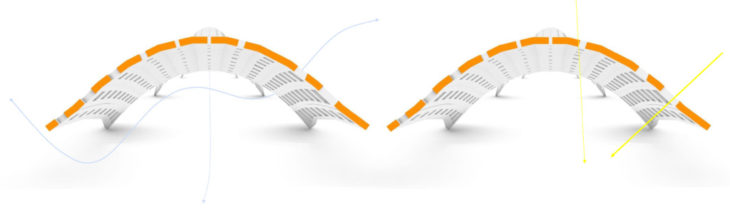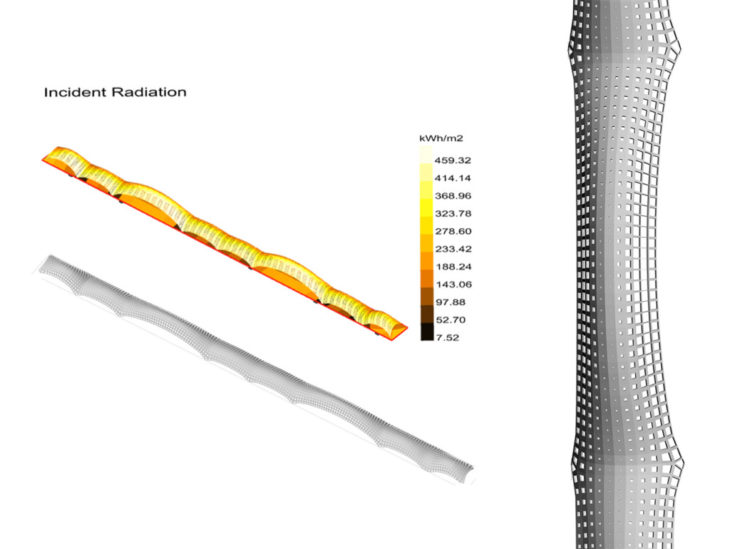 The only pedestrian bridge along the central district of Lleida is exposed to a lot of uniform sunlight: the design intention is to have a large surface areas for shading, small openings for light inlet, and opened sides for ventilation. The receptivity of incident radiation of the pedestrian bridge cover can reach up to 874 kWh/m2. This is an indicator that the pedestrians and the ground itself will be exposed to radiation a lot less.